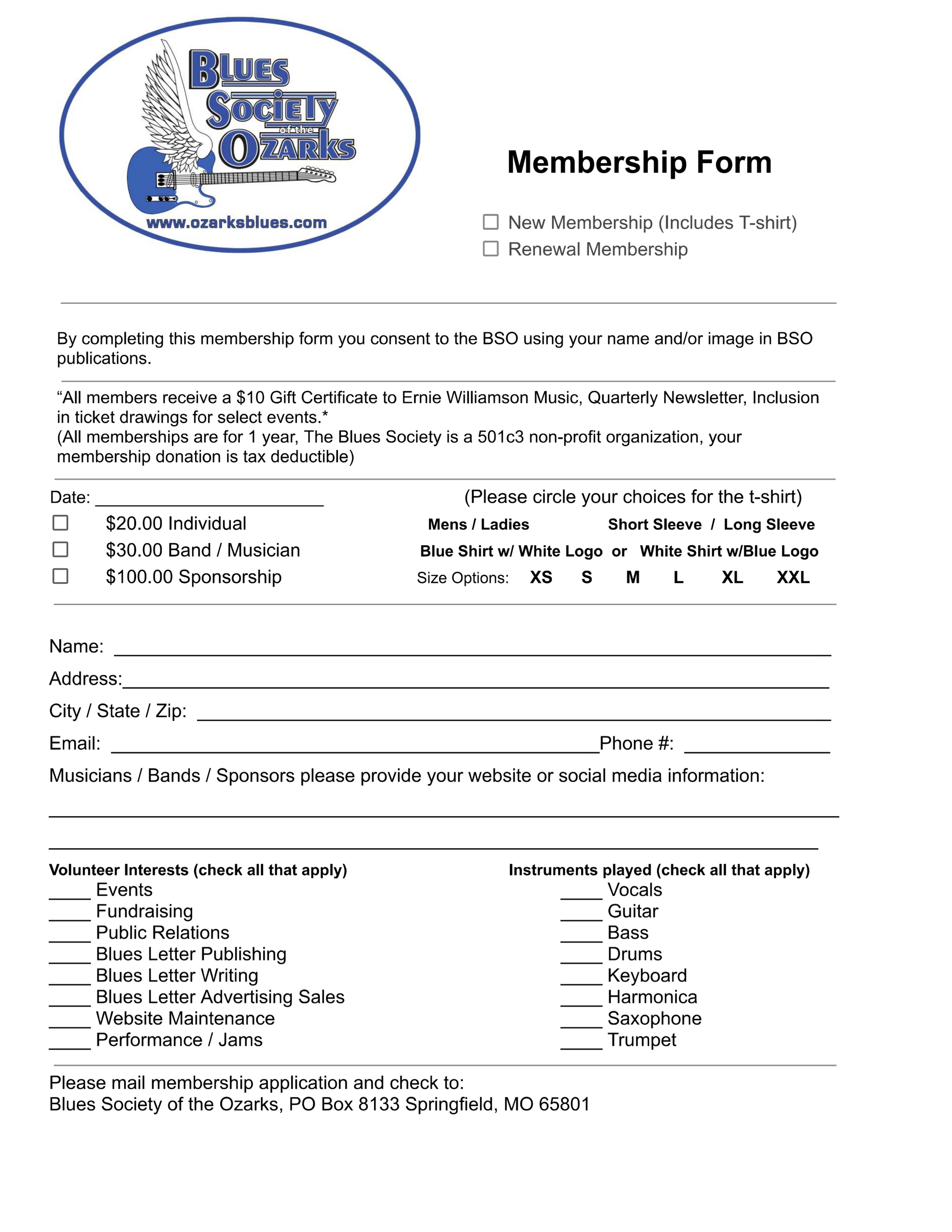 The Springfield Blues Society has different options for memberships: Individual, Musican/Band and Sponsors.